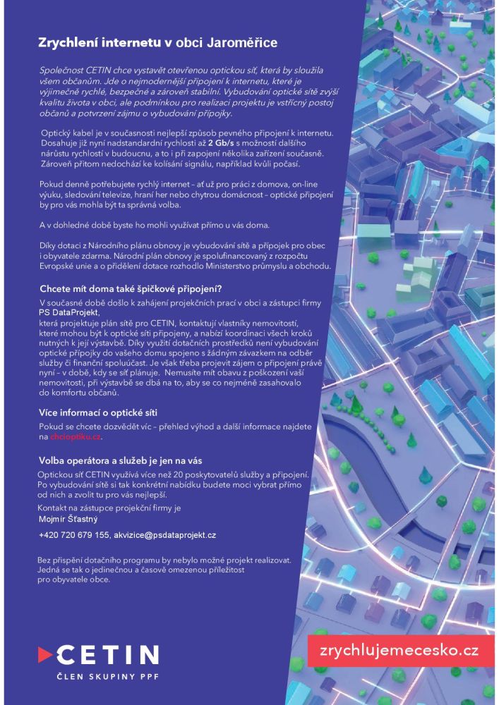 V obci Jaroměřice bude společnost CETIN v průběhu roku 2024 budovat optickou síť, která výrazně zkvalitní a zrychlí poskytování internetového připojení. Celý projekt je hrazen z Národního plánu obnovy a vlastníci nemovitostí mají možnost získat přípojku v rámci projektu zdarma. Aby mohla být nemovitost zařazena do projektu, je třeba, aby vlastníci domu podepsali Souhlas s umístěním optické přípojky. Zástupce projekční firmy PS DataProjekt Mojmír Šťastný bude ve dnech 31.10. až 2. 11. od 8 do 17 hodin občanům k dispozici ve výstavní síni CŽP (čp. 200). Zde můžete smlouvy uzavřít. Pokud se nebudete moci v daném termínu dostavit, obraťte se s žádostí o uzavření smlouvy na Obecní úřad nebo využijte přiloženého formuláře, který vyplněný doručíte Obecnímu úřadu osobně, poštou nebo vložením do schránky na vstupních dvěřích do zámku. Na souhlasu musí být vyplněni a podepsáni všichni vlastníci nemovitosti, pro kterou žádáte o připojení. Vzor vyplněného formuláře naleznete rovněž v příloze. Doručené Smlouvy Obecní úřad předá zhotoviteli projektové dokumentace.