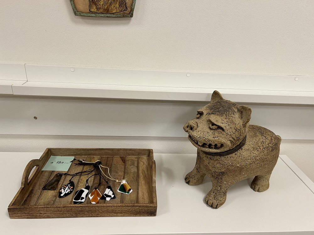 Na výstavě prezentuje početný cyklus domovních znamení, která se vážou k nejrůznějším zvířatům, rostlinám, i když tu najdete i vodníka nebo housličky. Kromě vitráží a mozaik si na výstavě prohlédnete světla, vyrobené technikou spékaného skla a v neposlední řadě olejem malované obrazy.